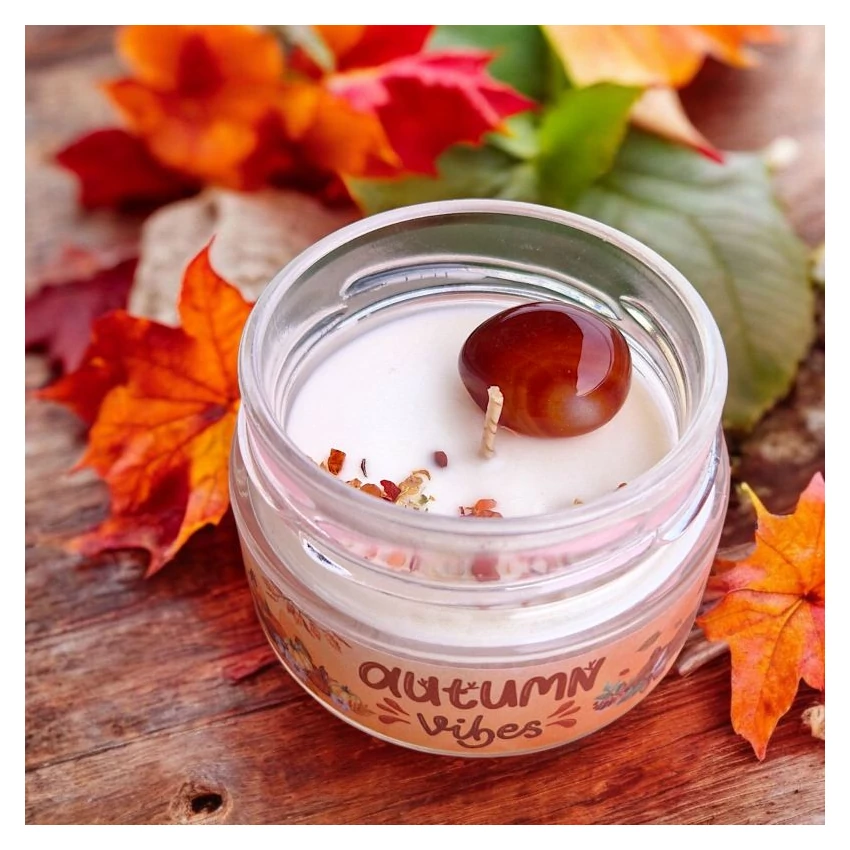 Összetevők | 100% natúr GMO mentes szójaviasz, nehézfém-mentes pamutkanóc, prémium minőségű parabénmentes illatolaj, ásványok (virág achát, karneol), szárított növények |