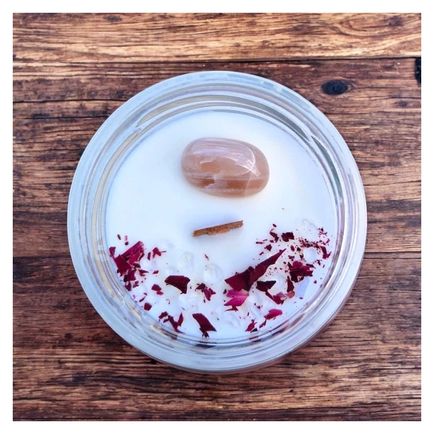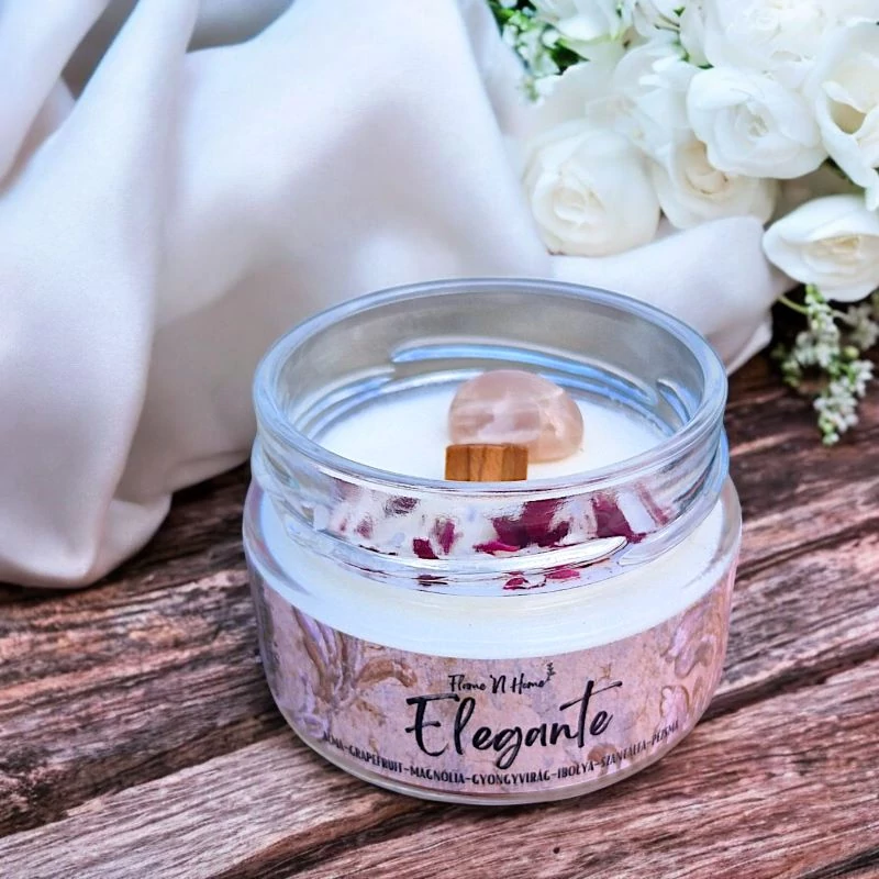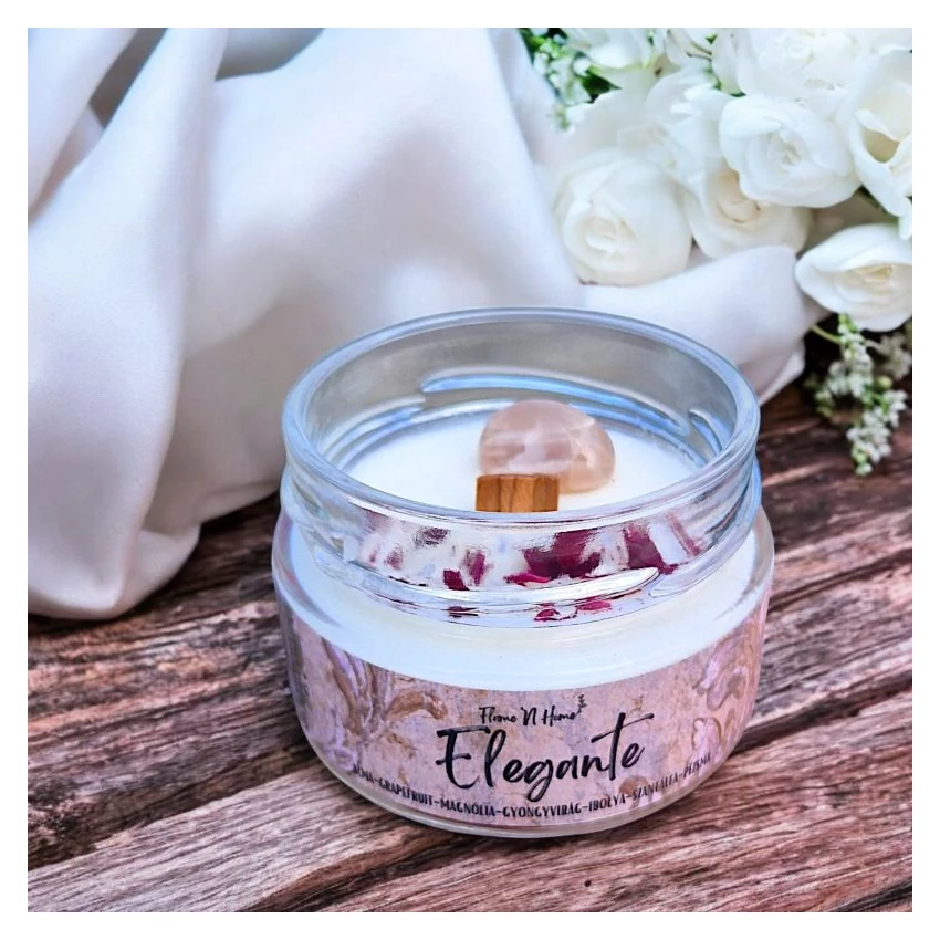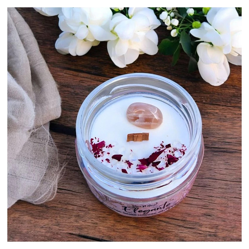 Összetevők | 100% natúr GMO mentes szójaviasz, fakanóc, prémium minőségű parabénmentes illatolaj, ásványok (barack holdkő, aurakvarc), szárított virágok |