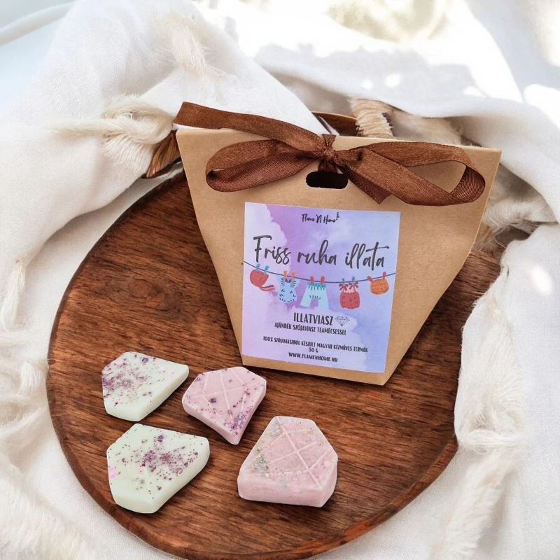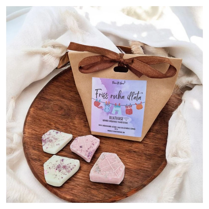 Az illatviaszok egy szép szalaggal átkötött papírtasakban készülnek, akár ajándékként is kiválóan megállják helyüket.