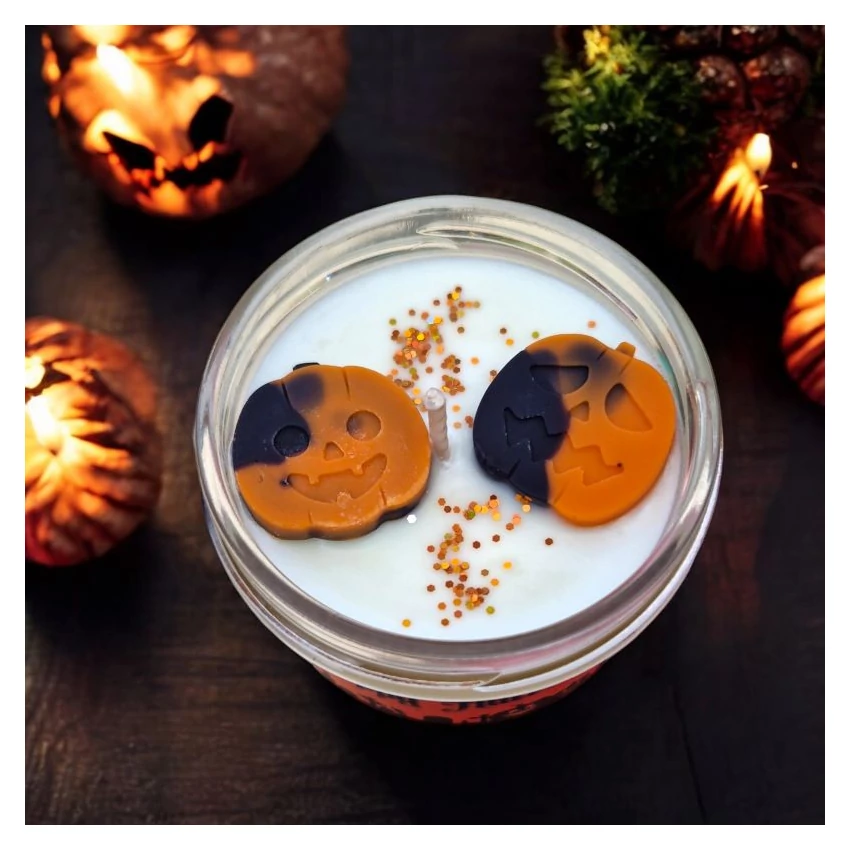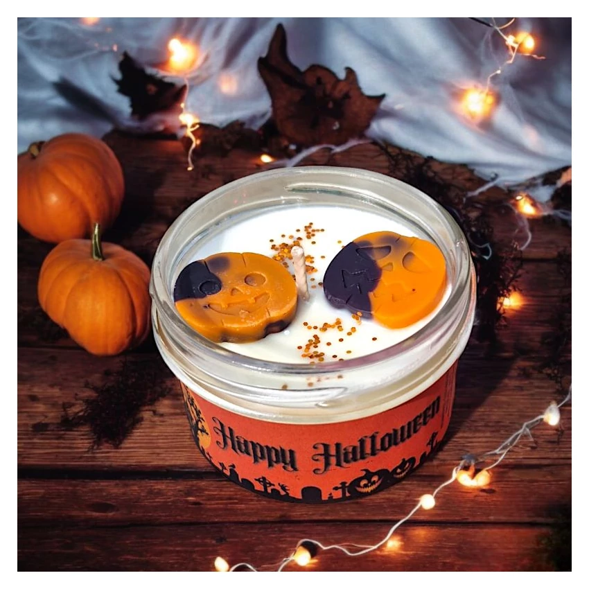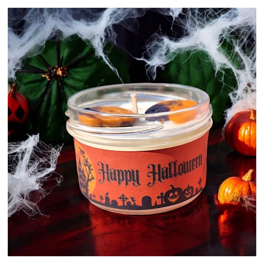 A Happy Halloween szójaviasz gyertya elhozza otthonodba a Halloween varázslatos és misztikus hangulatát. A gyertya tetejét vidám, tök formájú illatviaszok díszítik, amelyek azonnal ünnepi hangulatot teremtenek, tökéletesen illeszkedve a Halloween dekorációhoz.