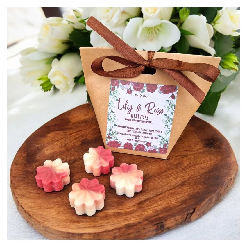 Az illatviaszok egy szép szalaggal átkötött papírtasakban készülnek, akár ajándékként is kiválóan megállják helyüket.