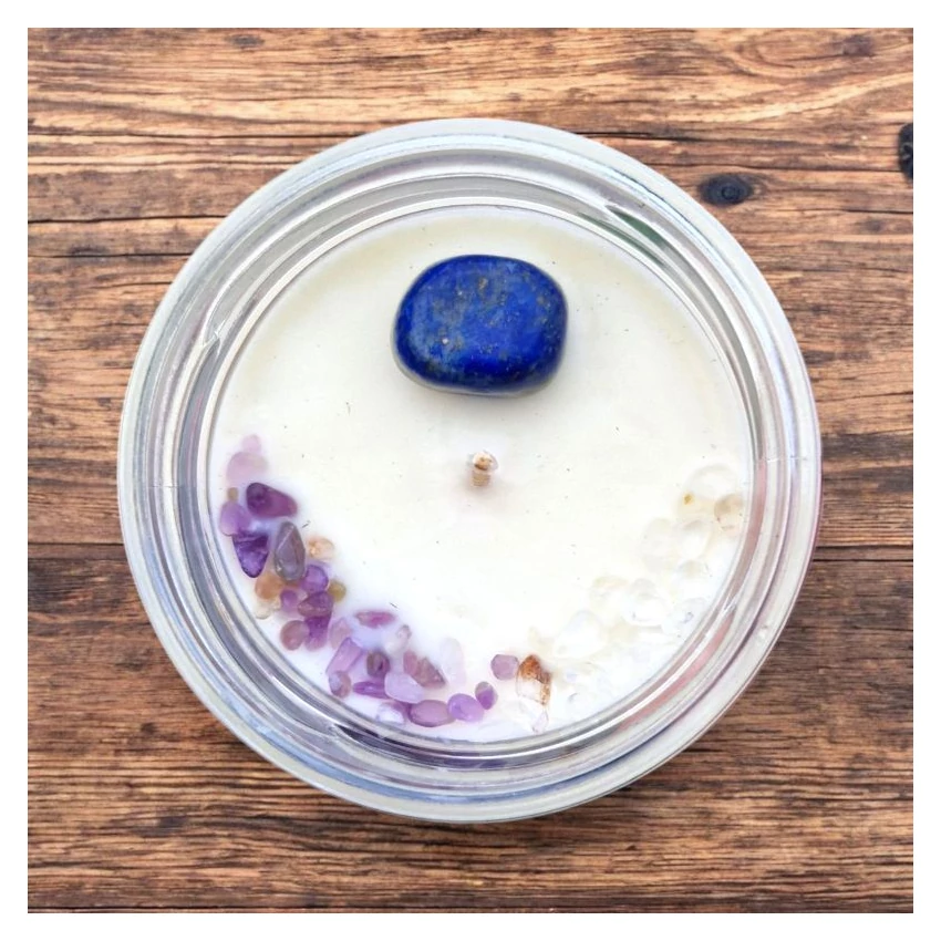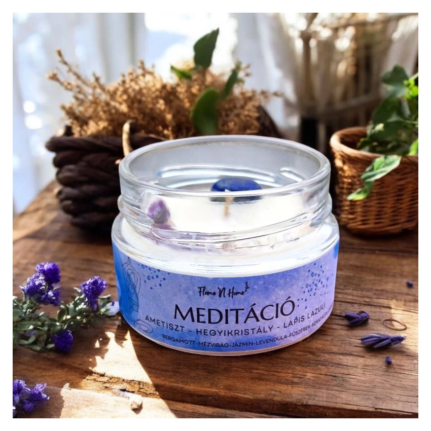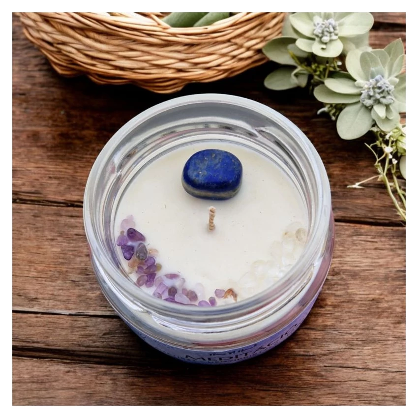 A gyertyában található ásványok (ametiszt, hegyikristály, lapis lazuli) nyugtató hatásúak, és meditáció közben segítik az ellazulást, koncentrálást.