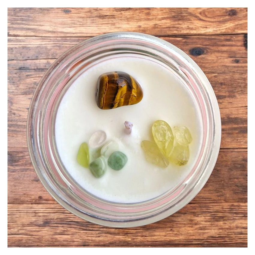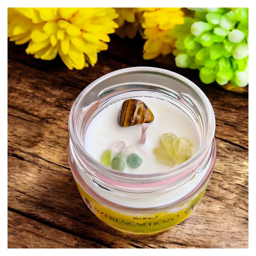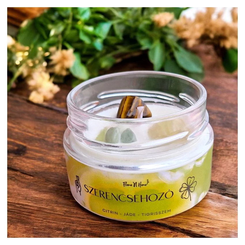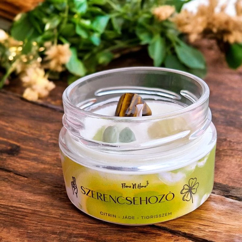 Összetevők | 100% natúr GMO mentes szójaviasz, nehézfém-mentes pamutkanóc, prémium minőségű parabén- és ftalátmentes illatolaj, citrin, jáde, tigrisszem |