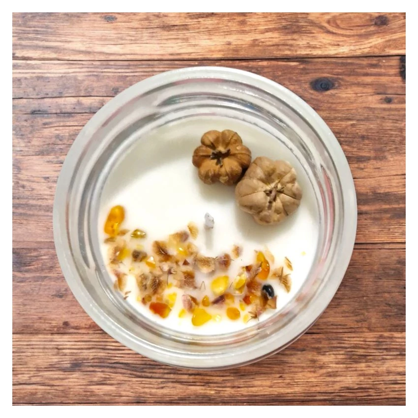 Összetevők | 100% natúr GMO mentes szójaviasz, nehézfém-mentes pamutkanóc, prémium minőségű parabénmentes illatolaj, ásványok (borostyán), szárított növények |