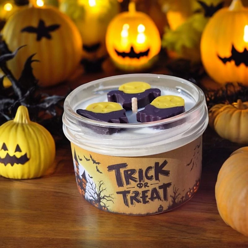 A Trick or Treat szójaviasz gyertya a Halloween legvidámabb hagyományát, a "csokit vagy csalunk" játékos hangulatát hozza el otthonodba. A gyertya tetején található aranyos, szellem formájú illatviaszok garantáltan mosolyt csalnak mindenki arcára, miközben tökéletesen illeszkednek a Halloween színes világához.